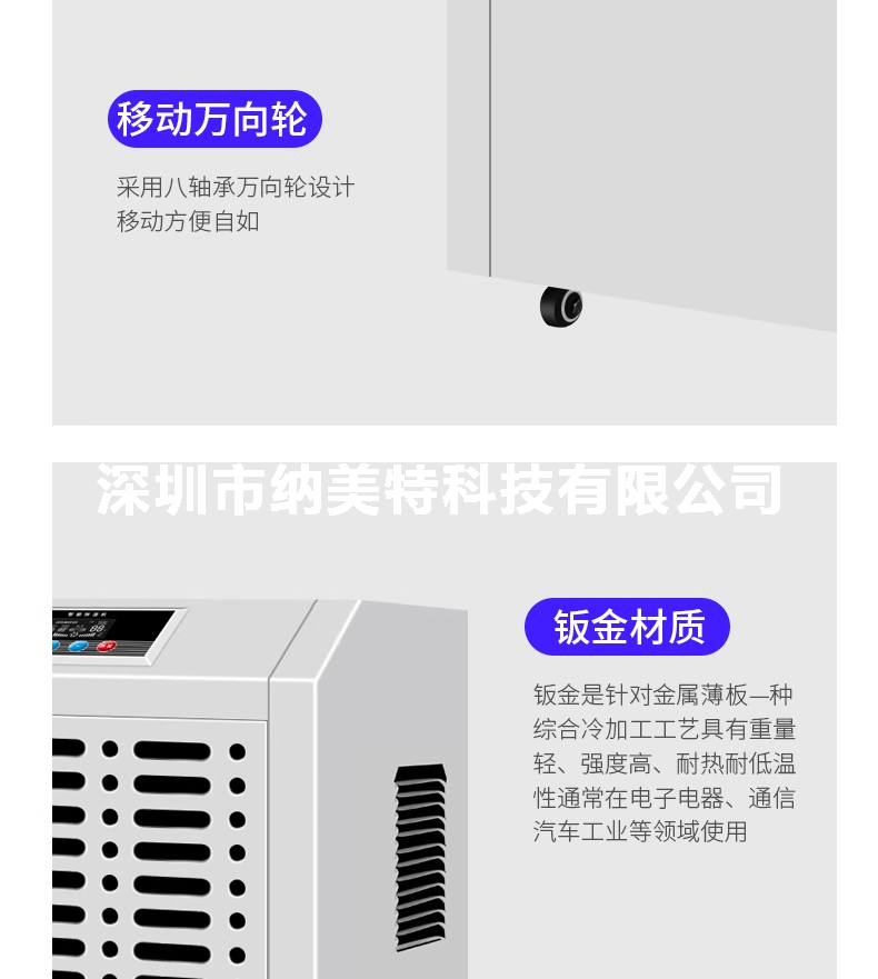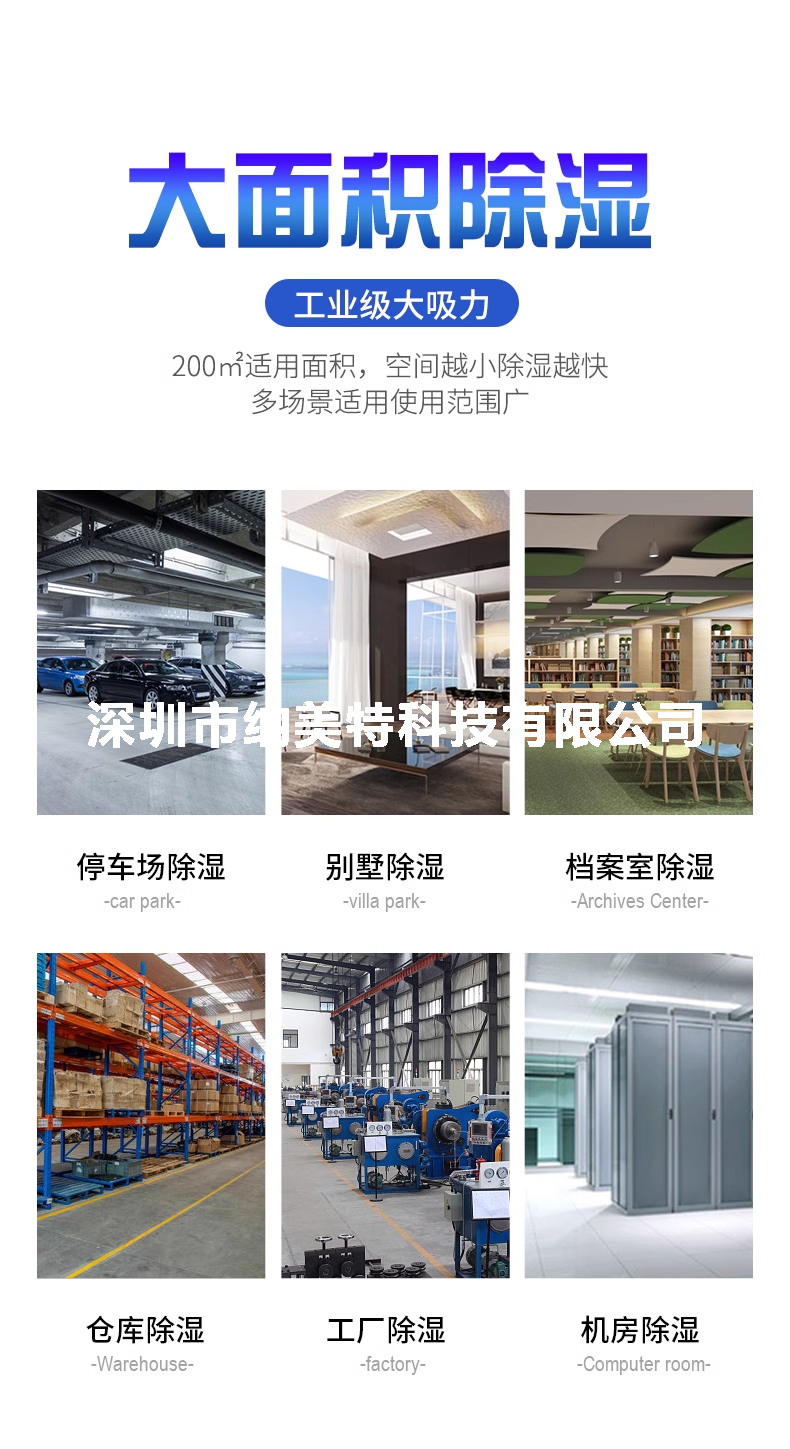纳美特工业除湿机广泛应用于贵重物品仓库、制药、食品、电子、皮革、鞋业、家具、印刷制品、化工、烟草等诸多行业。使物品避免了因潮湿、霉变带来的重大损失。产品适用面积大,特别适用于大型车间及仓库使用。