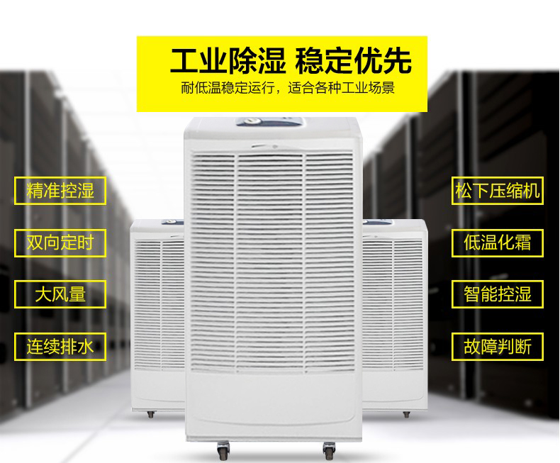 工业除湿机通过风机抽入潮湿空气,通过冰冻的蒸发器凝结成水,汇集容器内或经水管引流排走,干爽空气由出风口排出,湿度逐渐下降。