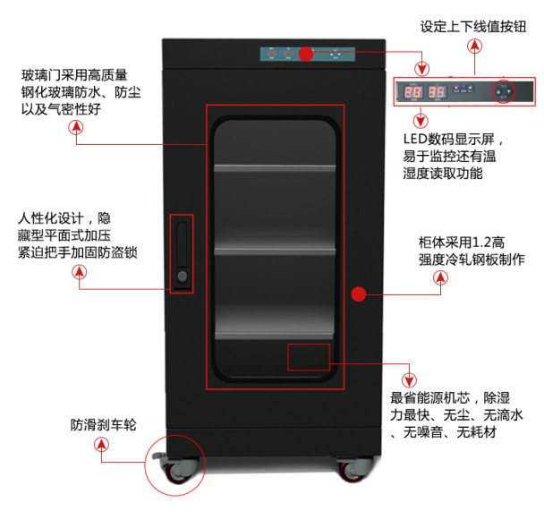 1、强力机芯:控湿强,除湿快,最低控制≤20%RH以下。