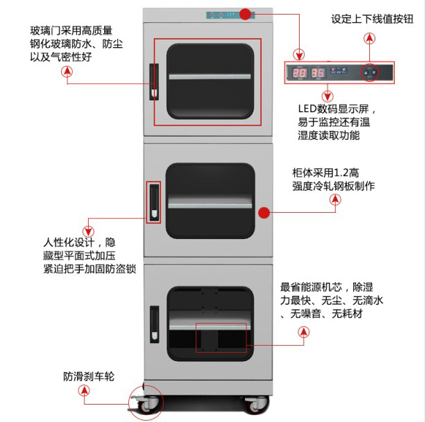 1、强力机芯:控湿强,除湿快,最低控制≤10%RH以下。