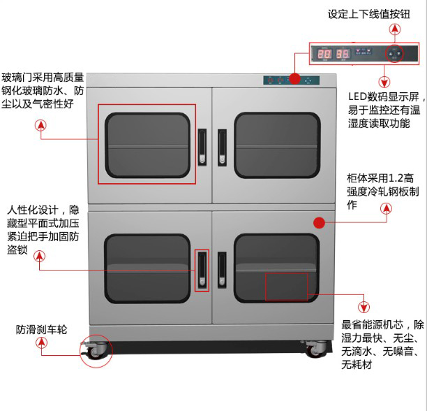 1、强力机芯:控湿强,除湿快,最低控制≤10%RH以下。