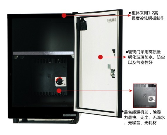 5、最省能源机芯,除湿速度快,无尘,无滴水,无噪音,无耗材。
