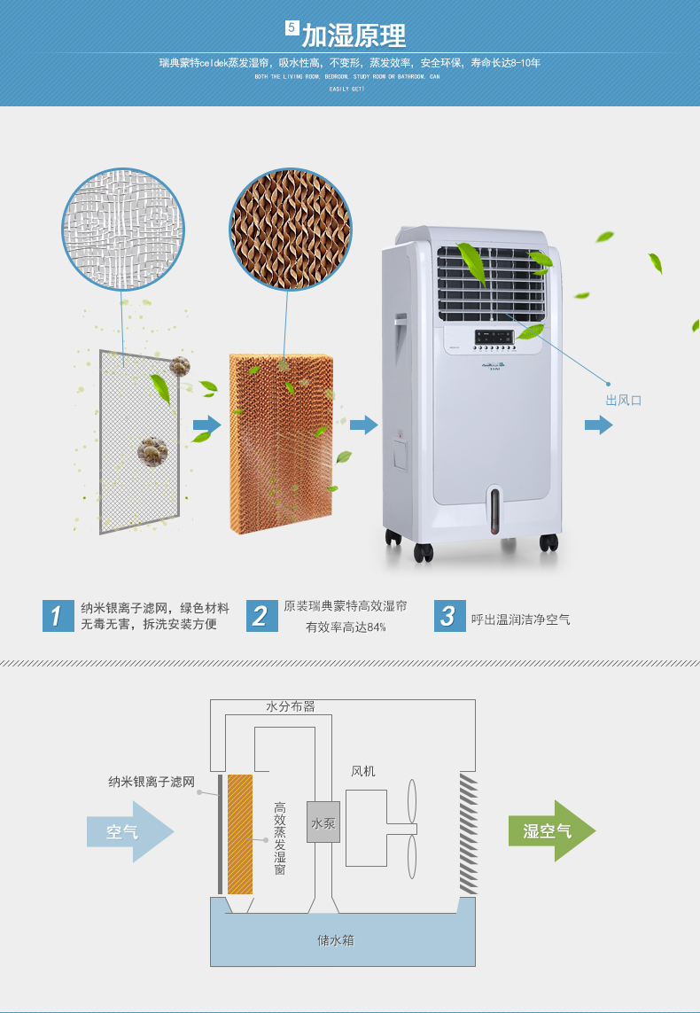 5、采用涡轮风扇、循环风大、加湿效率高。