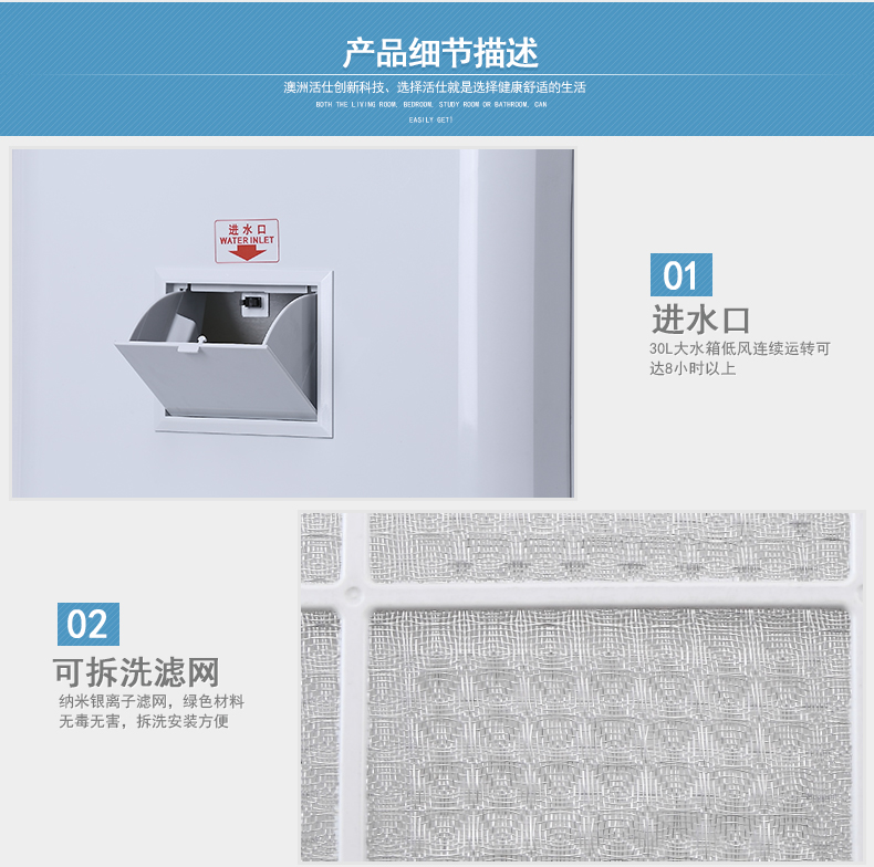 6、蒸发材料对空气具有净化作用,除去室内空气中的灰尘和溶于水的有害气体。