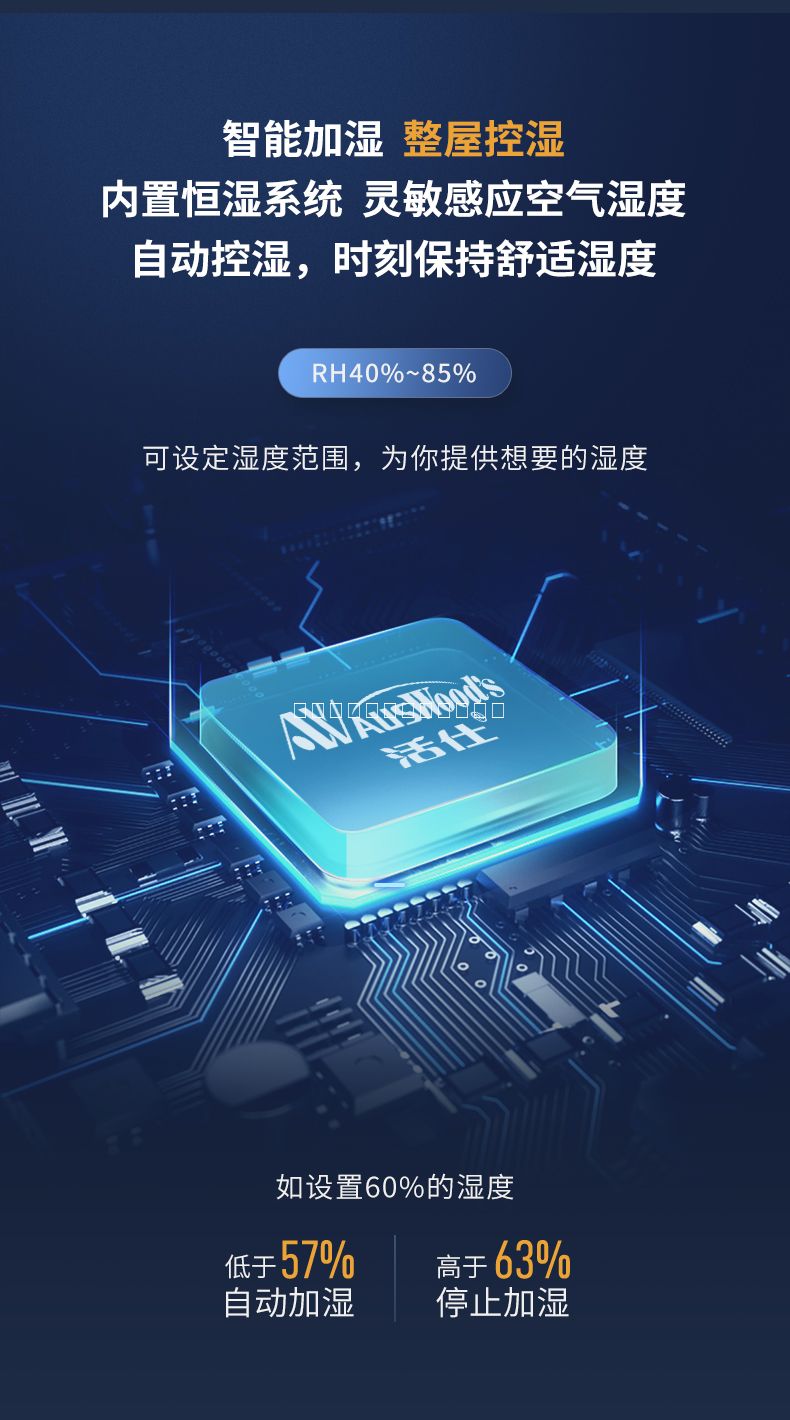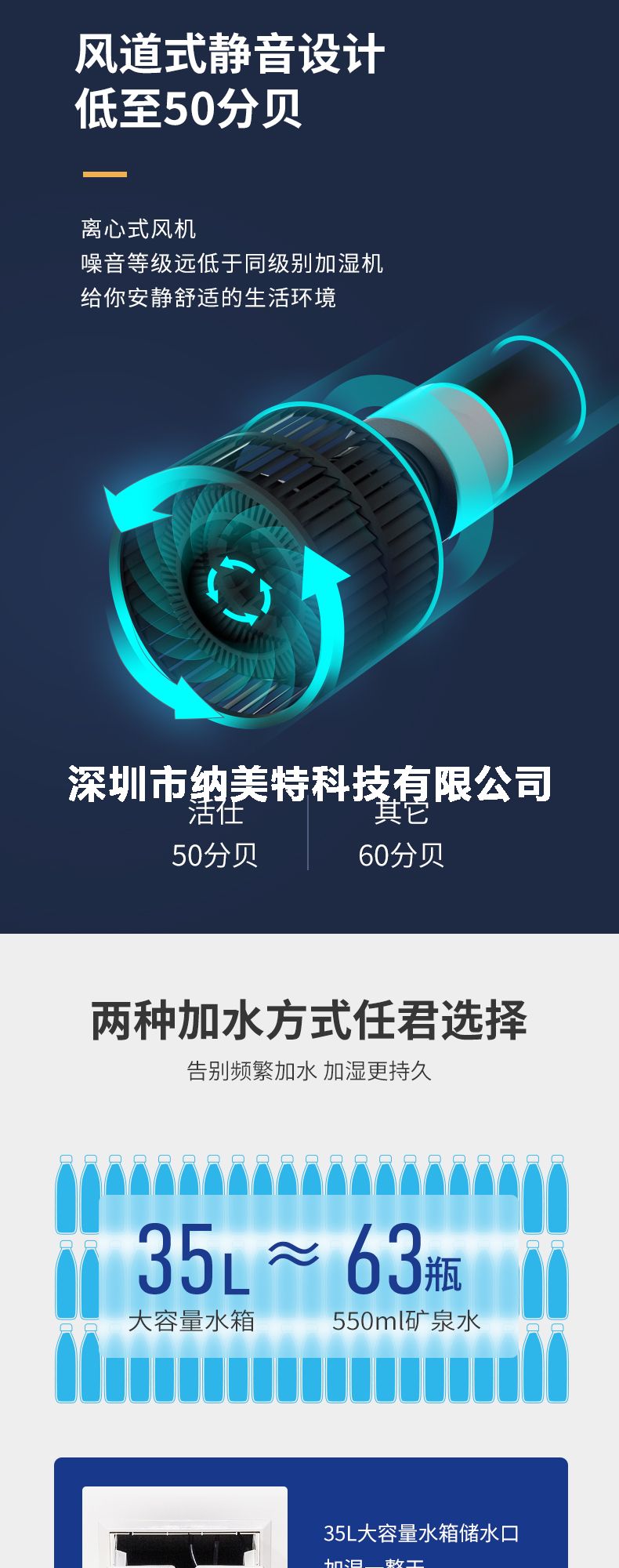 10、离心式风机,风量大,风道式静音设计低至50分贝,噪音等级远低于同级别加湿机;