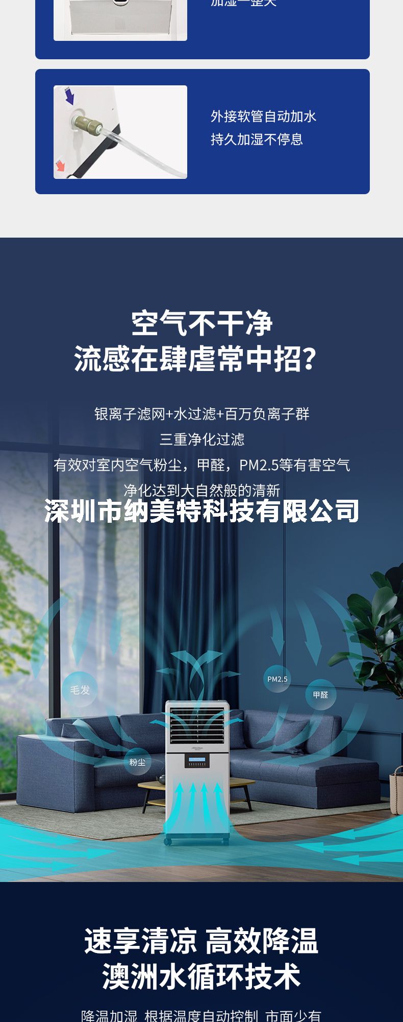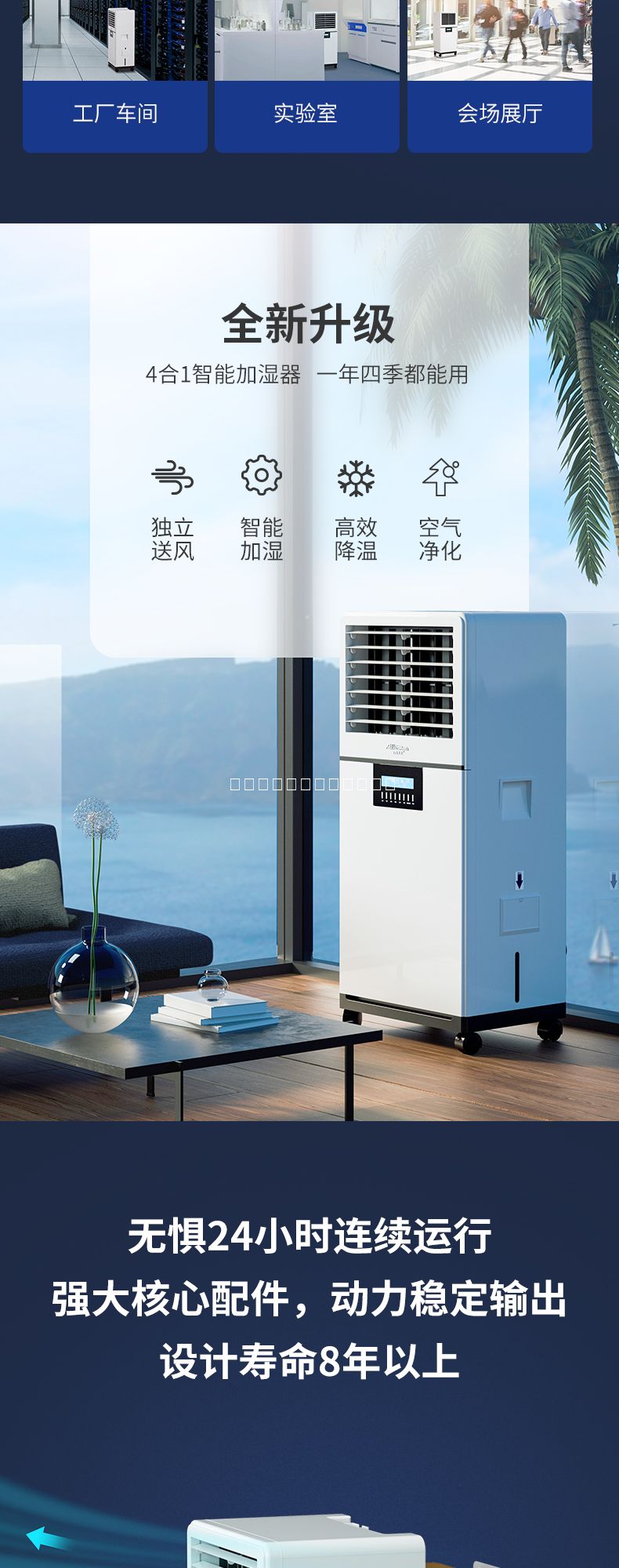 15、四合一智能加湿器,一年四季皆可用,独立送风,智能加湿,高效降温,空气净化。