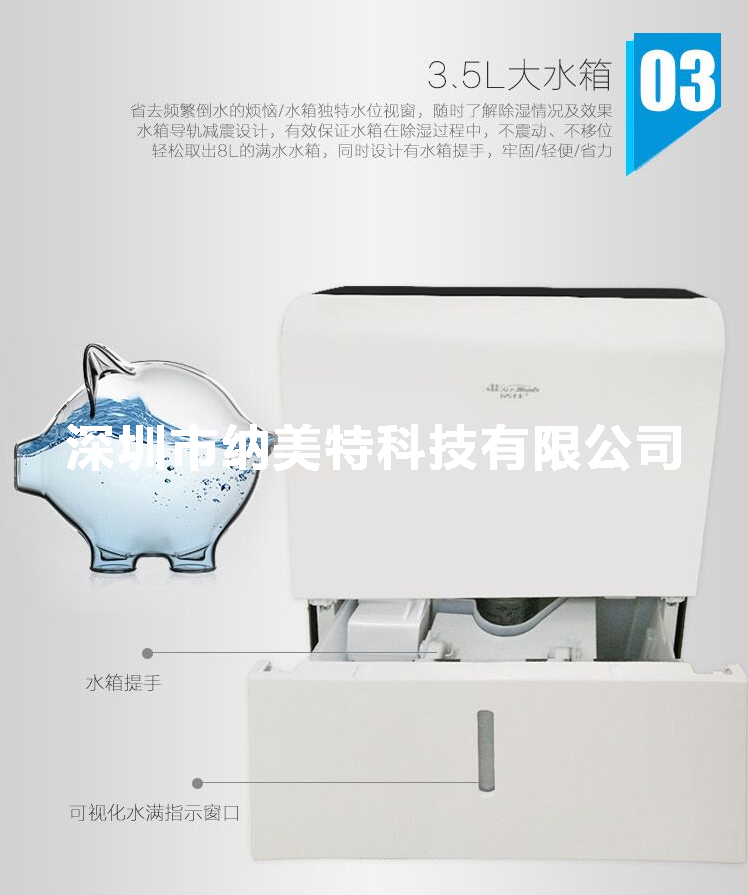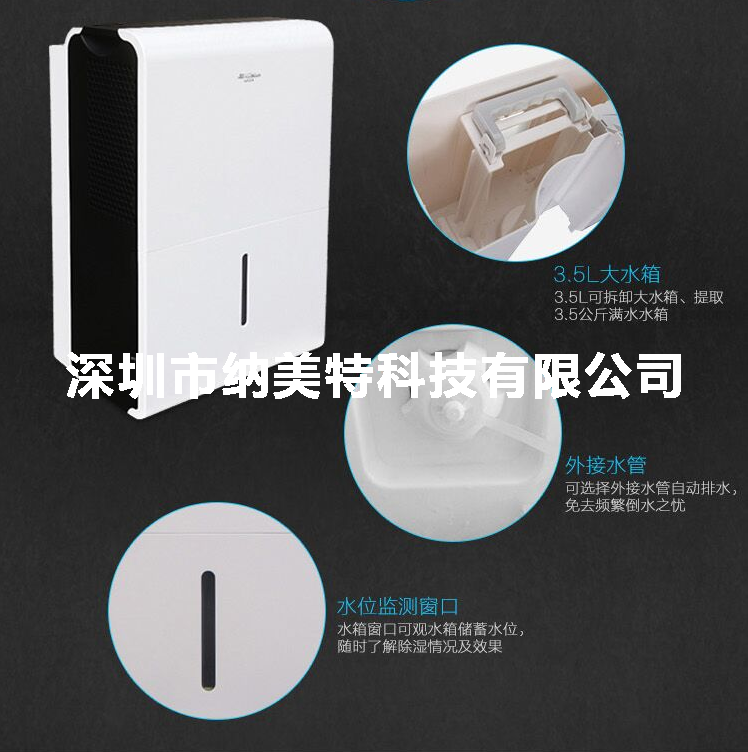 3、3.5升大水箱,水满后自动停机并报警,可外接水管直排